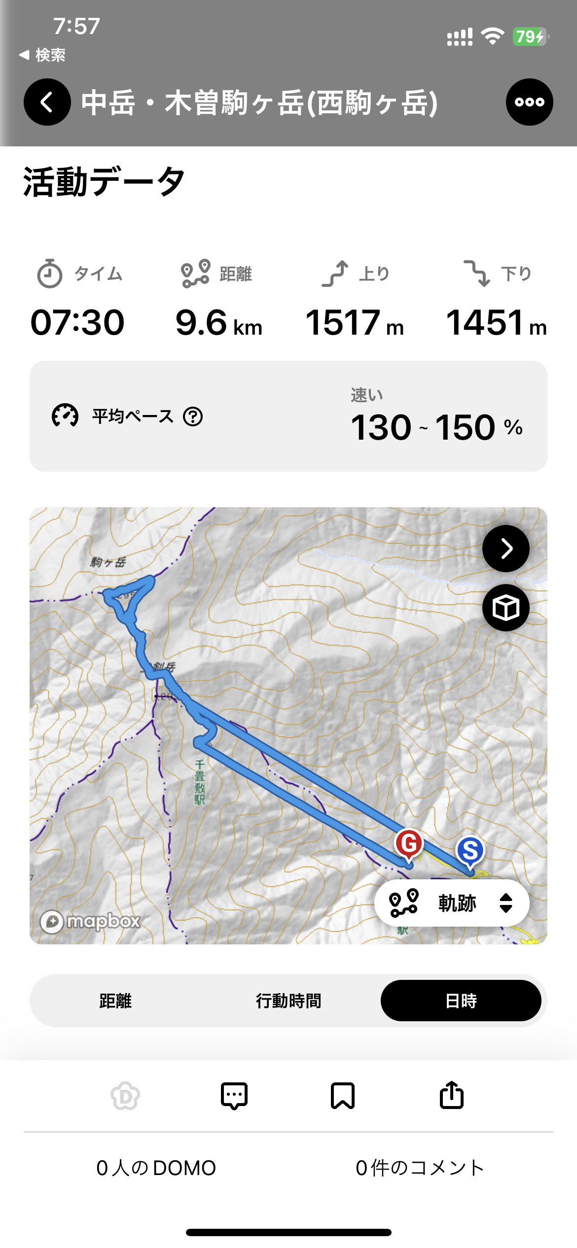ロープウェイに乗る前からYAMAPを起動したため、標高差が1,500mになっていますが、実際の標高差は350mぐらいです。